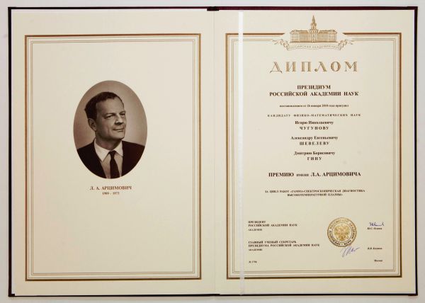 Президиум Российской академии наук постановлением от 26 января 2010 года присудил премию имени Л.А. Арцимовича за цикл работ «Гамма спектроскопическая диагностика высокотемпературной плазмы» сотрудникам ФТИ им. А.Ф. Иоффе И.Н.Чугунову, А.Е. Шевелеву и Д.Б. Гину.